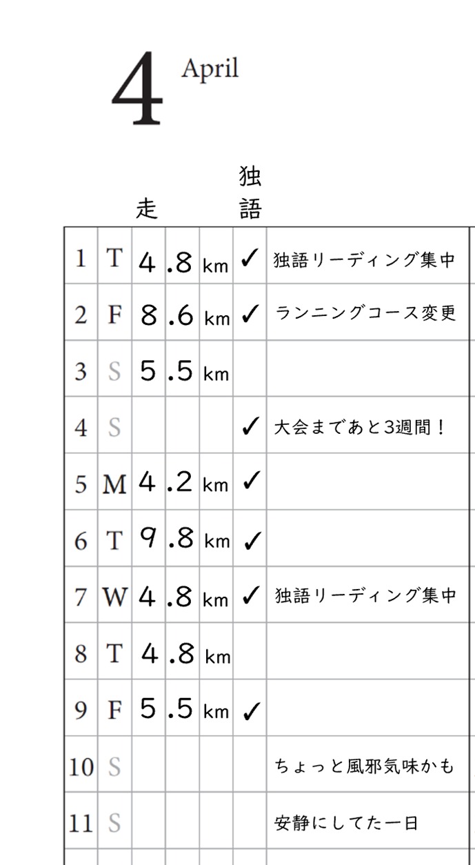 「大会まであと〇週間」などひとこと記入することでモチベーションもアップします。